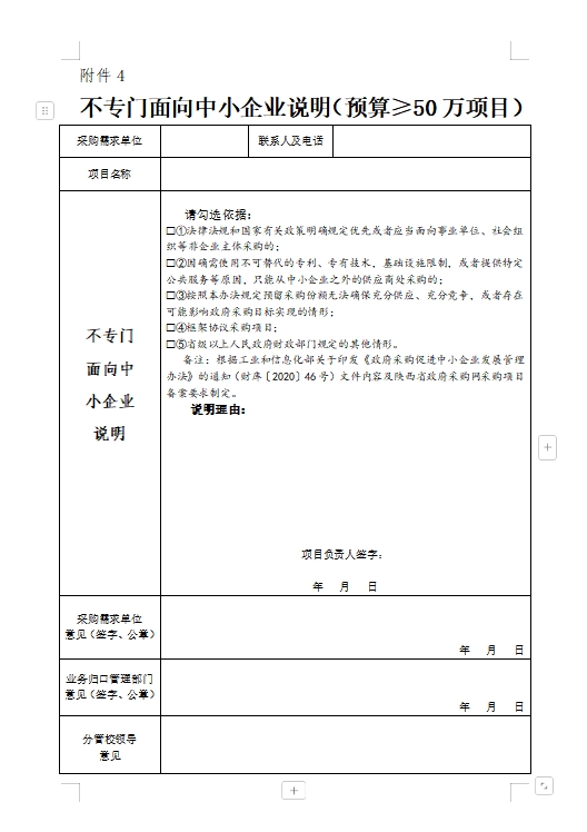 采购人需进行充分的市场调研,熟悉采购项目,对符合可不专门面向中小企业的五种情形之一的,填写招标与采购处网站下载中心栏目的《西安医学院采购计划申请表及相关表格(试行)(新)》,在附件4“不专门面向中小企业说明(预算≥50万项目)”页勾选原因并详细说明理由,并另附单独情况说明文档。